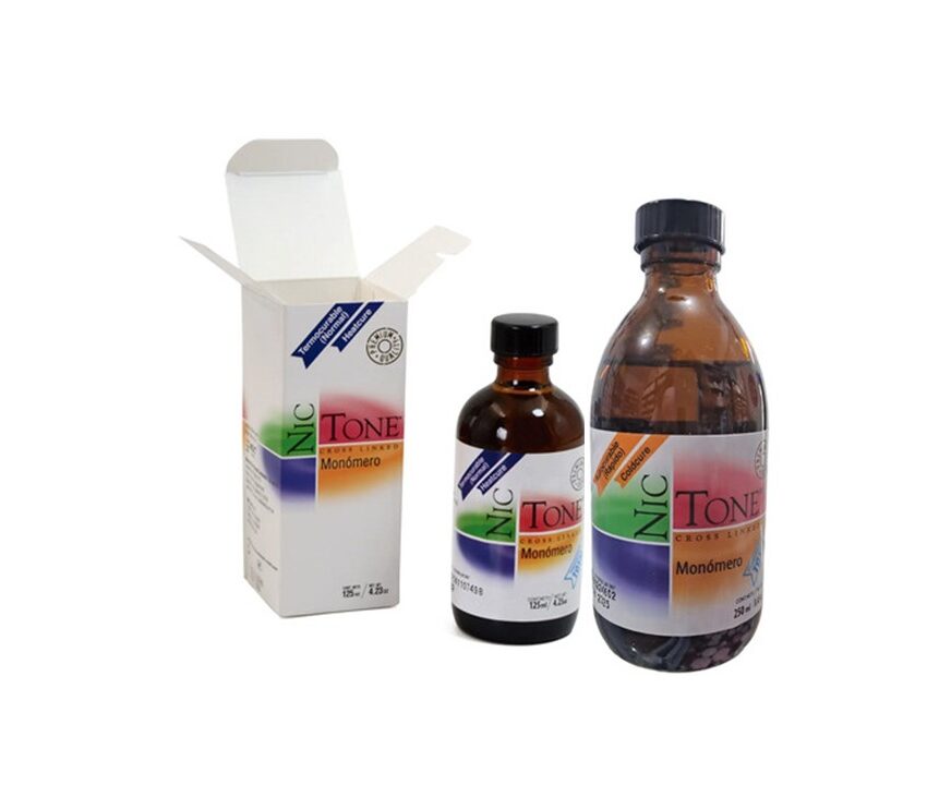 El monómero Nictone es un líquido acrílico de alta calidad utilizado en odontología para mezclar con polímeros de PMMA, formulado con ésteres y glicoles para una polimerización cruzada eficiente. Disponible en versiones Rápido (autocurable) para reparaciones y Normal (termocurable) para prótesis, ofrece gran estabilidad, resistencia y durabilidad.