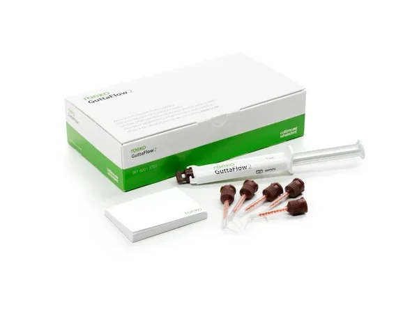 GuttaFlow 2 es un sistema de obturación en frío para la obturación de conductos radiculares que combina dos productos en uno: gutapercha en polvo con un tamaño de partícula de micras y un sellador, ambos de polimerización rápida cuando se combinan. GuttaFlow es la primera gutapercha fluida no calentada que no se contrae, sino que se expande ligeramente. Presenta una ligera expansión y se adhiere muy bien a la punta de gutapercha (punta maestra) y a la dentina. Por lo tanto, no necesita la tediosa condensación.