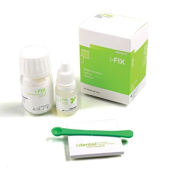 Cemento de fijación de ionómero de vidrio, bioinerte, de curado químico y alta adhesión a dentina, esmalte y aleaciones no preciosas.