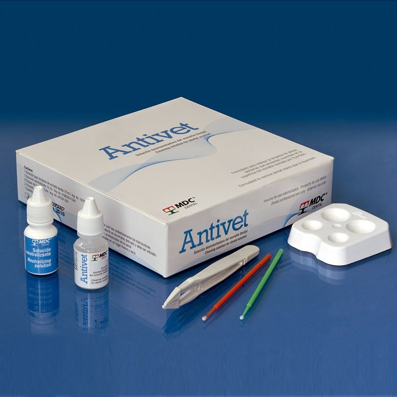 Antivet es un kit de tratamiento odontológico profesional, especializado en eliminar manchas intrínsecas (como la fluorosis) y extrínsecas (cigarro, café) en una sola sesión. Utiliza una fórmula química (ácido clorhídrico estabilizado) que remueve manchas sin desgastar significativamente el esmalte ni causar sensibilidad, garantizando resultados inmediatos y permanentes.