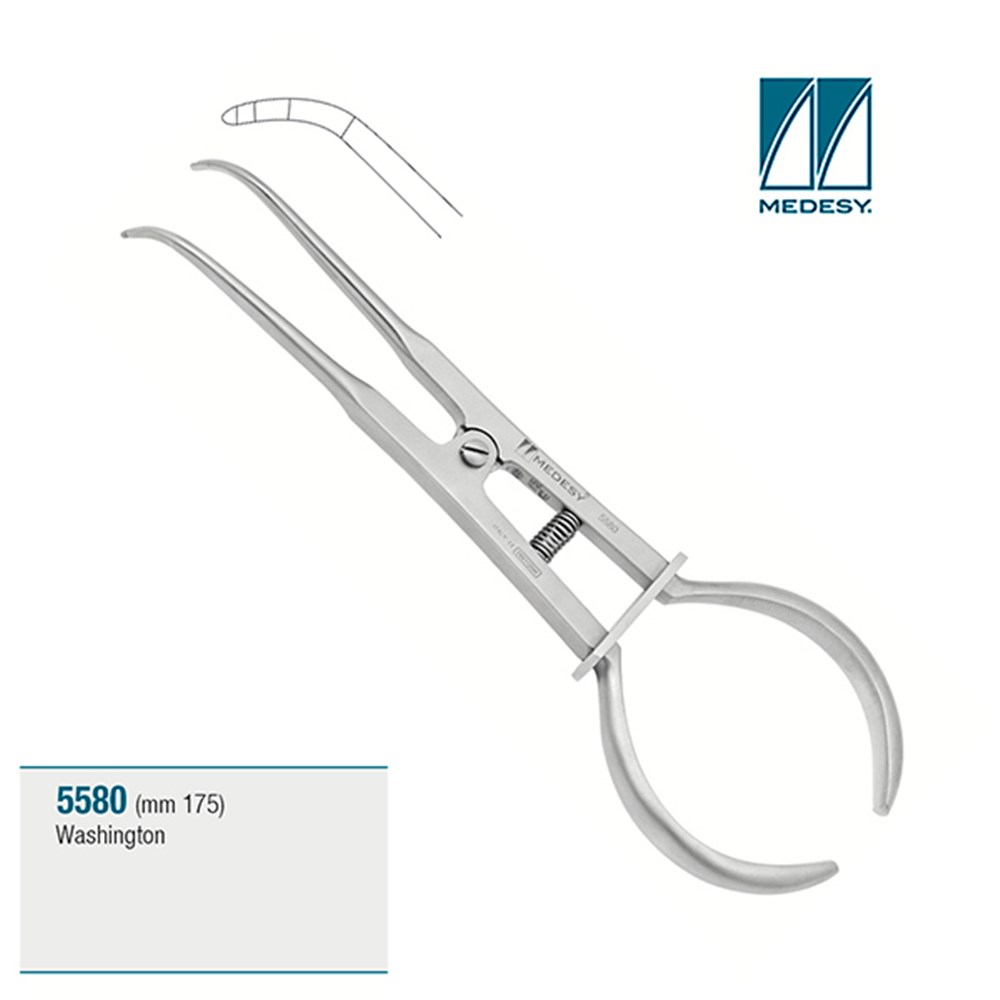 La pinza porta clamps Washington de Medesy es un instrumento esencial diseñado para la colocación y remoción precisa de grapas (clamps) durante el aislamiento absoluto con dique de goma. Su diseño ergonómico y longitud de 175 mm garantizan un control superior y acceso facilitado a todas las zonas de la cavidad oral.