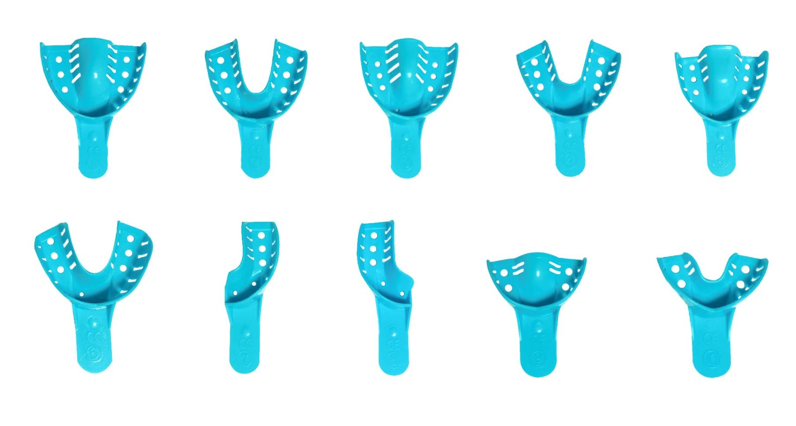 El kit de cubetas plásticas para impresiones dentales incluye un total de 10 cubetas en diferentes formas y tamaños, diseñadas para adaptarse a diversas anatomías y necesidades clínicas. Cada cubeta está fabricada en plástico resistente, con un diseño que permite una excelente retención del material de impresión y un manejo cómodo durante el procedimiento.